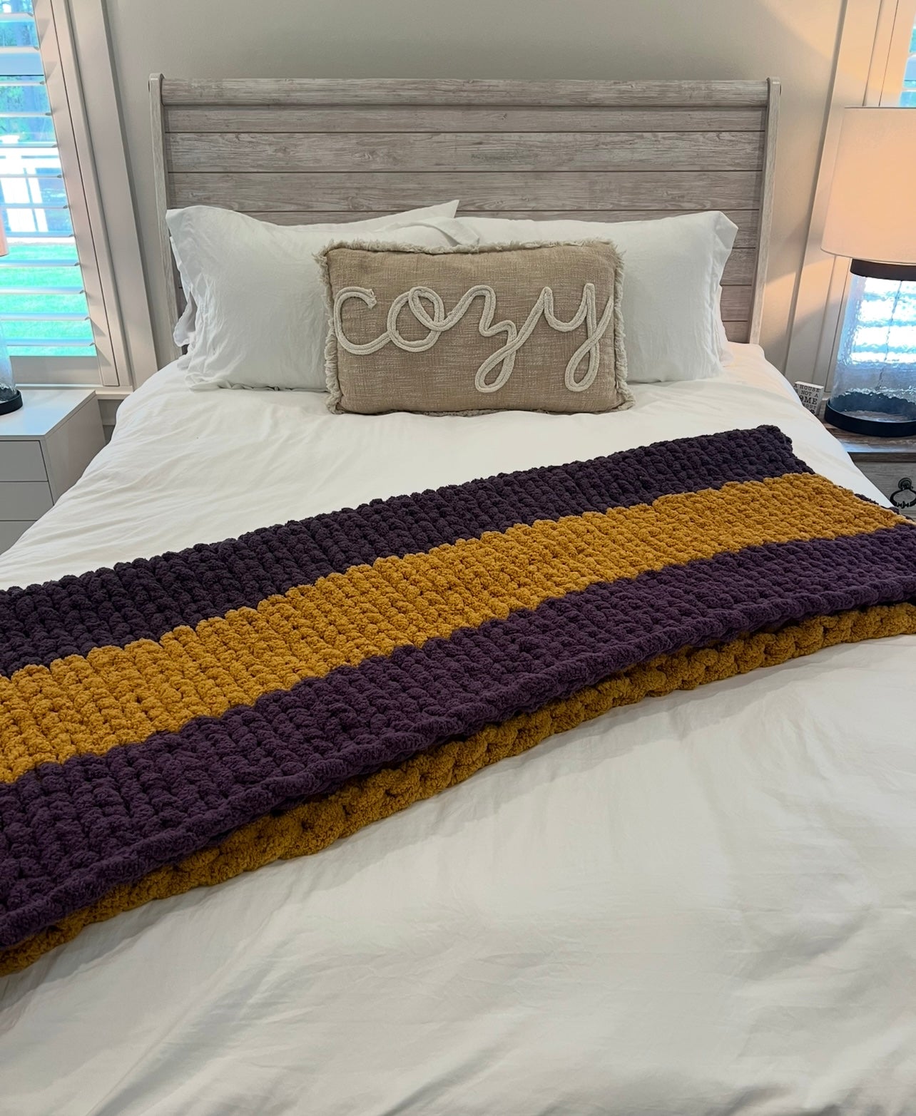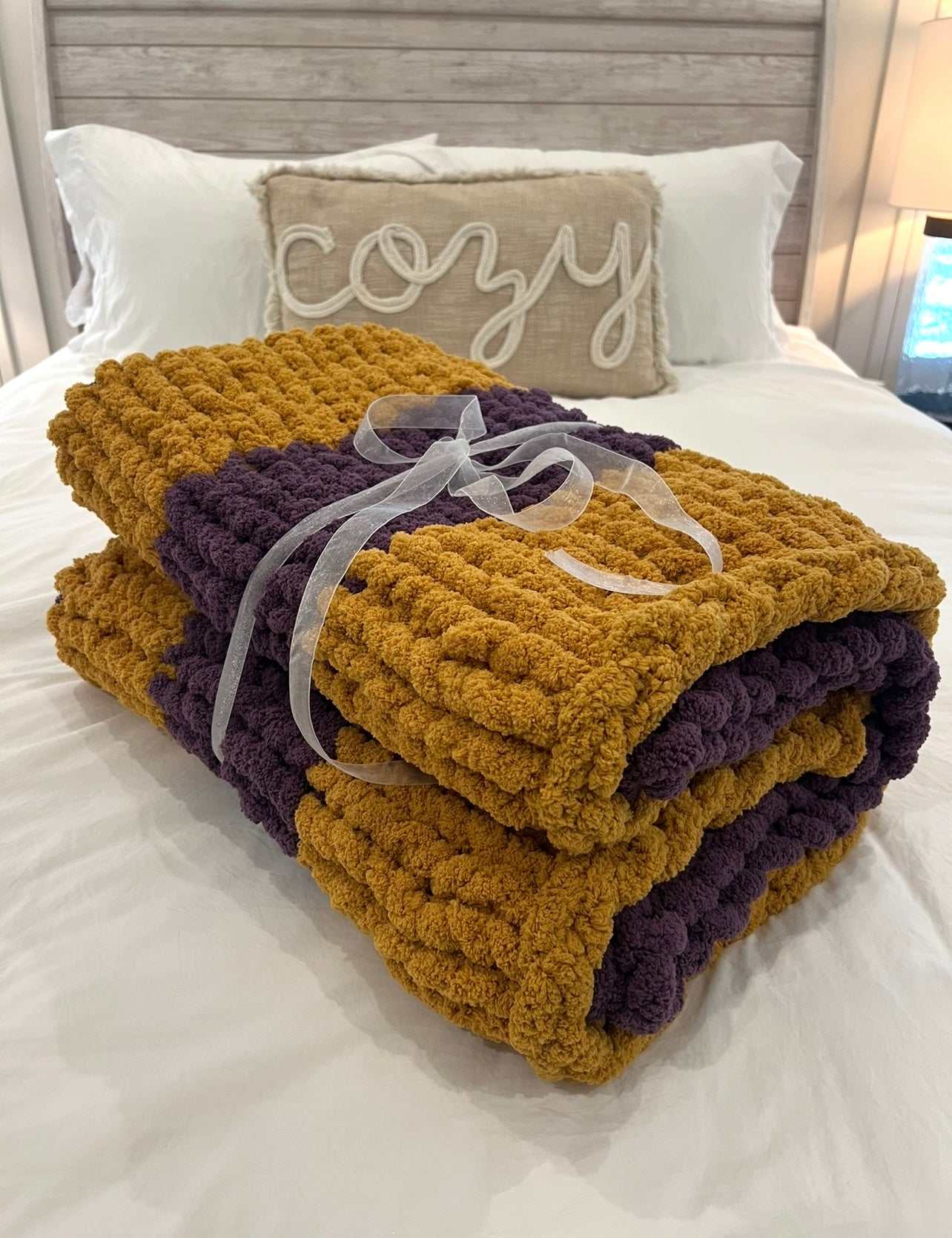 LSU is a handmade blanket with a blend of amethyst purple and gold yarn. Cozy up with this beautiful and soft throw!